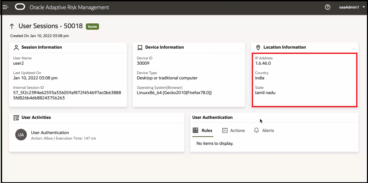 Ce tutoriel considère un scénario dans lequel l'administrateur utilise la règle prête à l'emploi Défi basé sur la vitesse maximale de l'appareil pour détecter ce type d'activité utilisateur frauduleuse, déclencher une alerte et empêcher l'utilisateur de se connecter avec succès. Cette opération est effectuée conjointement avec les données de géolocalisation. L'administrateur peut surveiller les alertes, les actions, les règles et d'autres informations relatives à l'utilisateur via le tableau de bord Session utilisateur.