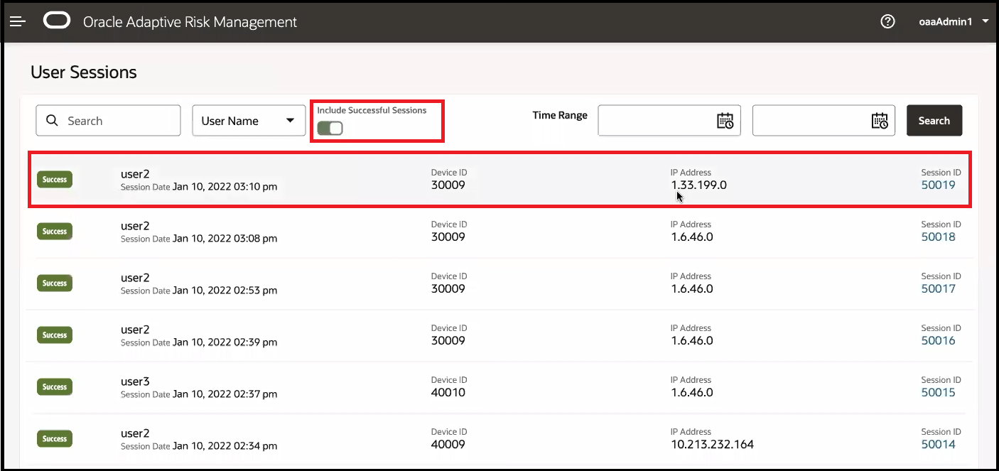 Cliquez sur le bouton Inclure les sessions réussies pour afficher la liste des connexions réussies. Vous remarquerez les détails de connexion user2 à partir du même périphérique, mais une adresse IP différente.