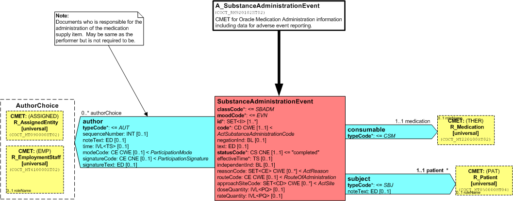 The A_SubstanceAdminEvent (identified/confirmable) CMET identifies the administration of a medication to a patient. It includes information about the author of the record, and administered substance.