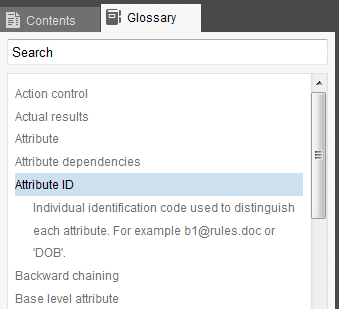 The Glossary is a list of key terms used in Oracle Policy Modeling. Click on the Glossary tab at the top of the left hand pane to open it.