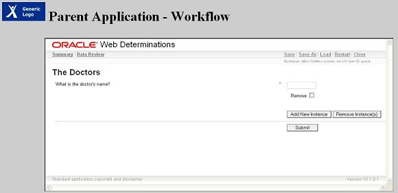 This following describes an approach to integrating Oracle Web Determinations into a parent (web) application's workflow/process. This means that part-way through the workflow, the parent application will hand over data to Web Determinations, which will then conduct an interview.