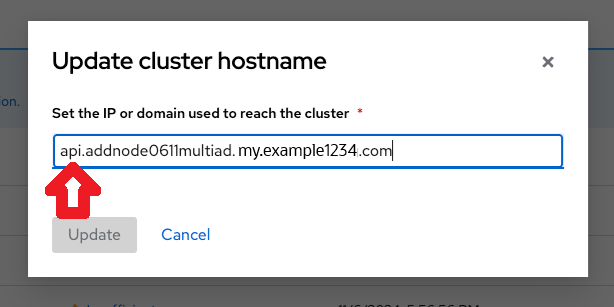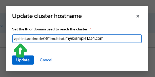 api-intfromapi. For example, if the string displayed isapi.addnode1234multiad.my.company.com, edit the prefix section of the string as follows:api-int.addnode1234multiad.my.company.com. - After you update the string, the Update button is enabled. Select the Update button to continue. The nodes' status changes to ready.