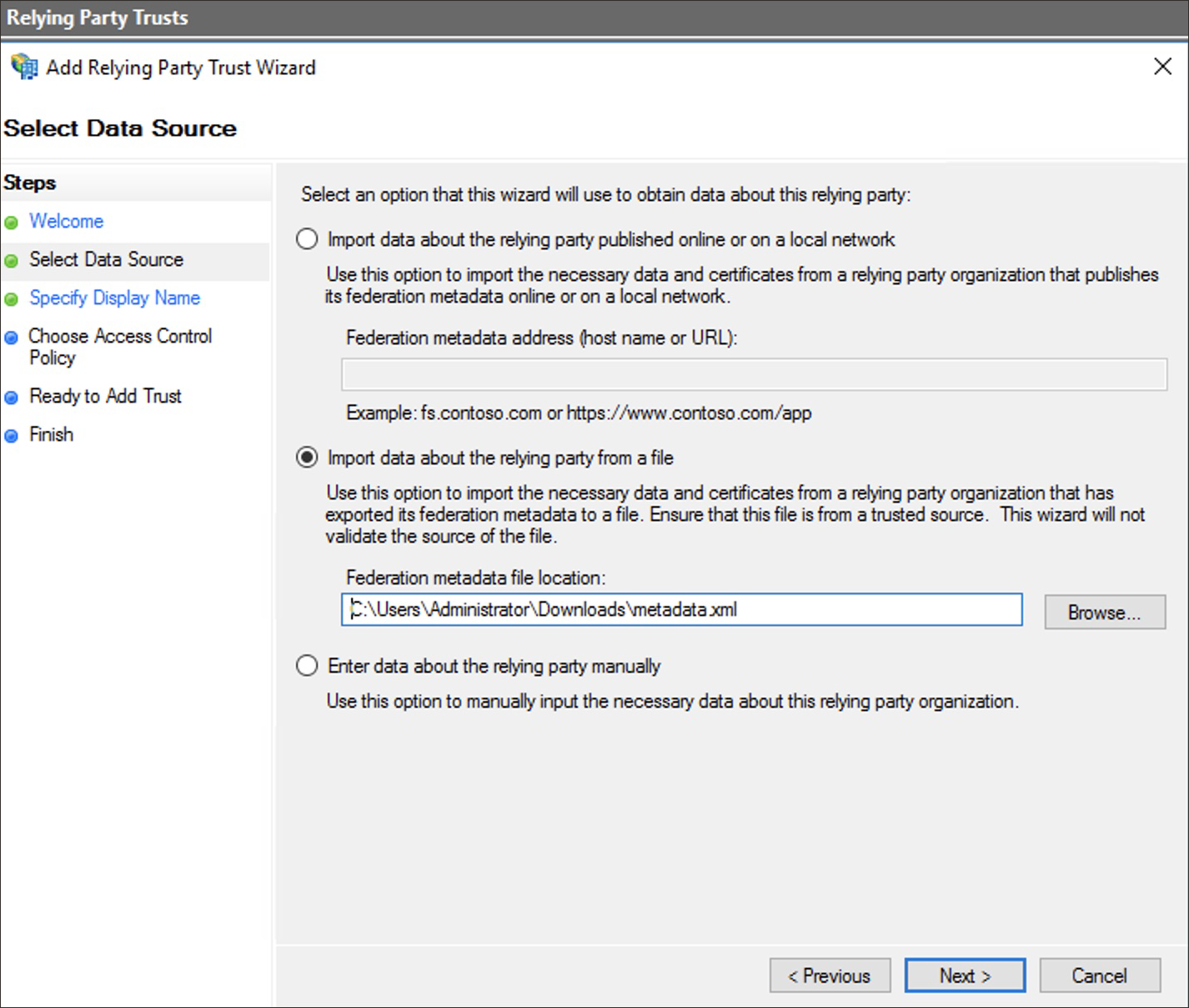 . Selezionare Successivo. - Selezionare Immetti IdP metadati.