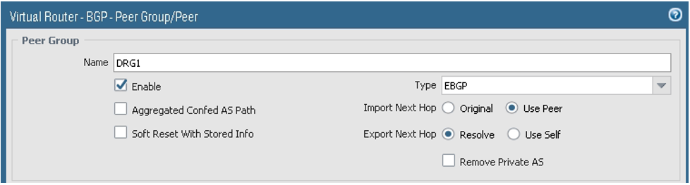 Nella scheda Gruppo di pari livello aggiungere il secondo gruppo di pari livello e, in Nome gruppo di pari livello, aggiungere la seconda sessione. Aggiungere la sessione BGP con il gateway DRG.