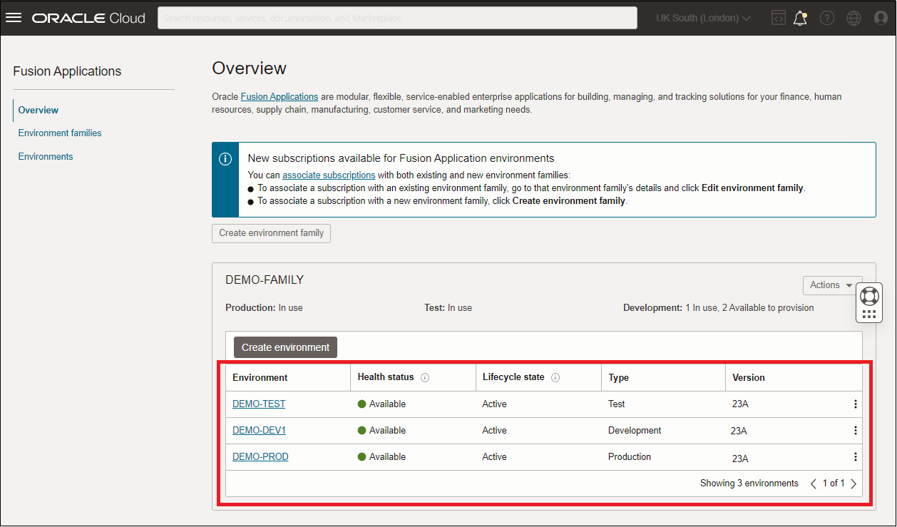 - Dopo aver eseguito l'accesso, verrà visualizzata la nuova console cloud con gli ambienti Fusion Applications elencati.