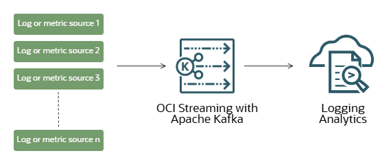- Utilizza OCI Streaming con Apache Kafka come metriche o processore di log da origini diverse. Gli strumenti di inclusione dei log, ad esempio l'API Fluentd, Logstash o Kafka Producer, possono raccogliere i log da varie applicazioni e inserirli negli argomenti Kafka per l'arricchimento e l'aggregazione dei dati. Utilizzando le API Apache Kafka, puoi arricchire i dati astraendo i dettagli dei log e inviandoli agli strumenti di analisi a valle per ulteriori funzionalità di elaborazione e ricerca avanzata dei log.
