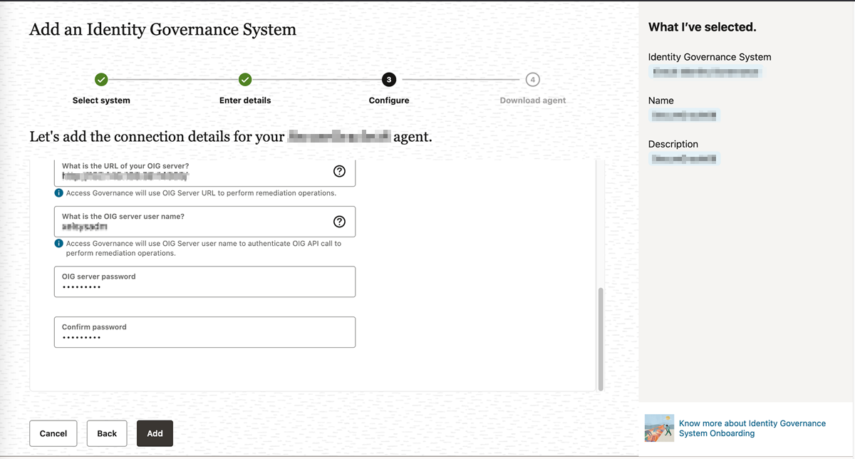 - Nel passo Configura immettere i dettagli della console del servizio OIG, come indicato di seguito.