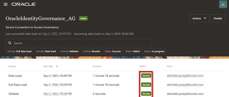 È possibile verificare lo stato di integrazione da Access Governance Console. Vedere la documentazione del prodotto Oracle Access Governance.