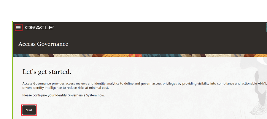 Nella pagina di arrivo di Oracle Access Governance fare clic su Start o sull'icona del menu di navigazione -> Amministrazione servizio -> Sistema connesso.