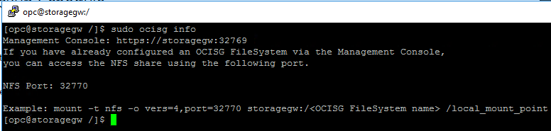 L'indirizzo IP visualizzato (10.0.0.37) è l'IP di Storage Gateway distribuito per questo esempio. Se non conosci le informazioni sulla porta NFS, dovrai eseguire ssh in Storage Gateway ed eseguire sudo ocisg info.