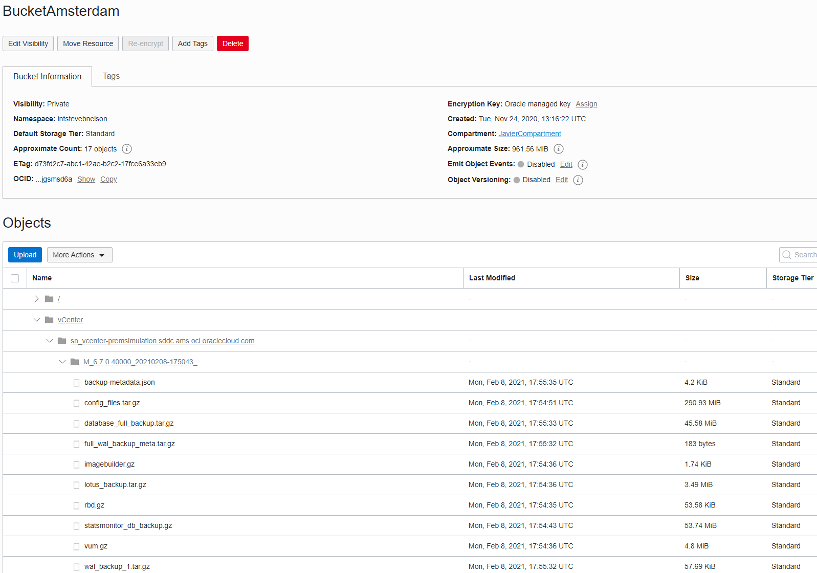 Ora possiamo passare allo storage degli oggetti OCI e verificare che il backup sia stato replicato.