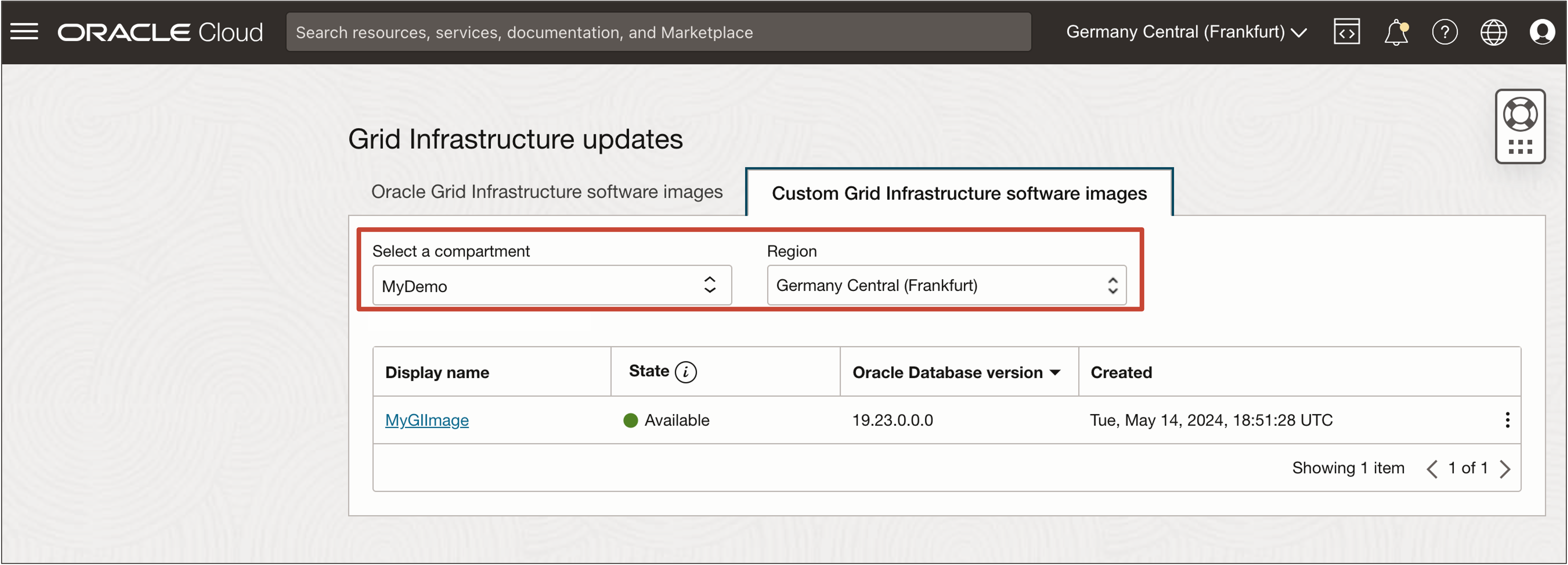 Nota: questa funzione è destinata a un modo semplice e automatico per creare immagini software di Oracle Grid Infrastructure specificando le personalizzazioni necessarie (patch una tantum) in aggiunta agli aggiornamenti di release delle immagini (RU) pubblicati da Oracle standard senza autorizzazioni speciali necessarie per scaricare le patch da MOS. Fornisce inoltre la capacità di semplificare la gestione delle immagini software di Oracle Grid Infrastructure in più aree. Questo miglioramento consente agli utenti di non dover creare e gestire la stessa immagine software in più aree. Possono creare un'immagine software di Oracle Grid Infrastructure in una region e accedervi da un'altra region, eliminando così gli sforzi e i costi di storage degli oggetti legati alla gestione della stessa immagine in più region.