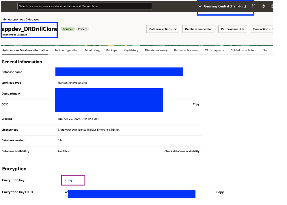 appdev_DRDrillClone) utilizzato nell'area 2. Passare ad Autonomous Database dalla sezione Oracle Database. È possibile vedere che viene creato e pronto per l'uso un database di copia completo. È inoltre possibile verificare che le chiavi fornite gestite dal cliente nelle proprietà dei membri DR di OCI Full Stack siano state utilizzate.
