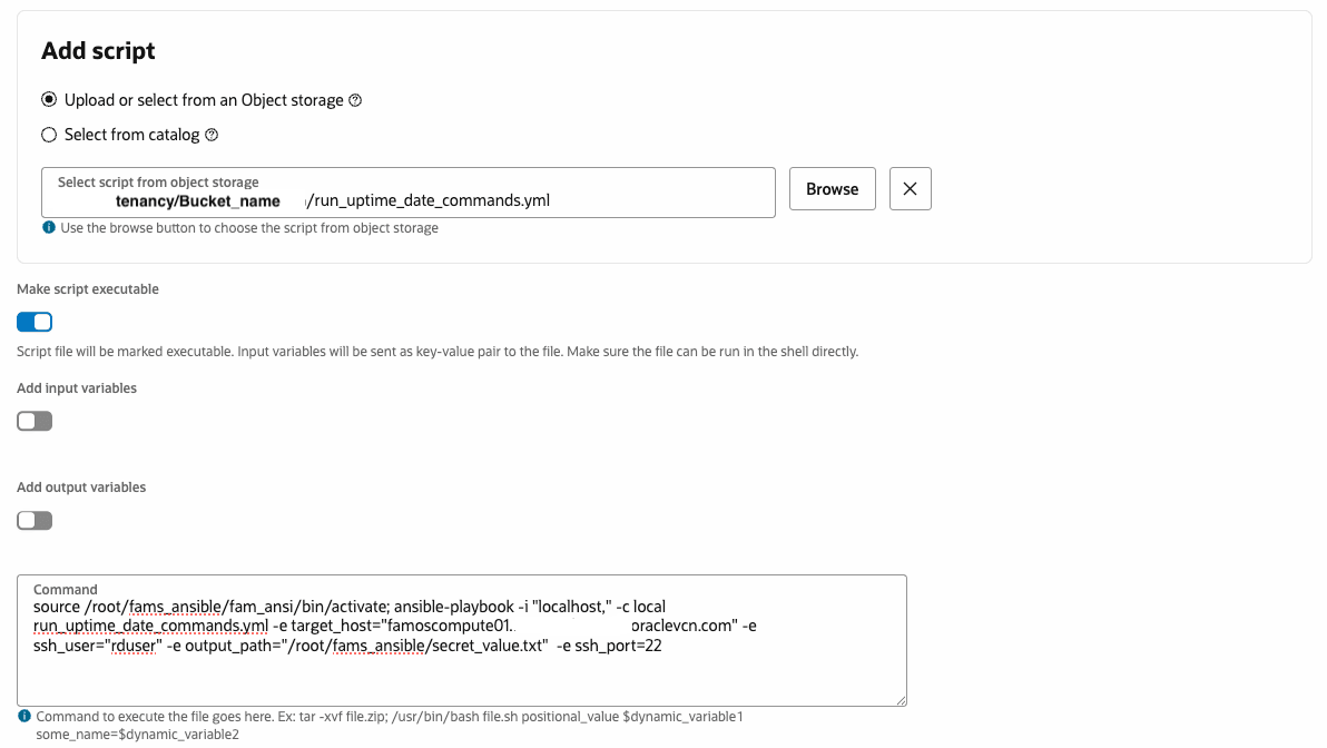 Executing command: /bin/sh -c set -e; source /root/fams\\_ansible/fam\\_ansi/bin/activate; ansible-playbook -i "localhost," -c local run\\_uptime\\_date\\_commands.yml -e target\\_host="famoscompute01.xxxx.xxxx.oraclevcn.com" -e ssh\\_user="rduser" -e output\\_path="/root/fams\\_ansible/secret\\_value.txt" -e ssh\\_port=22