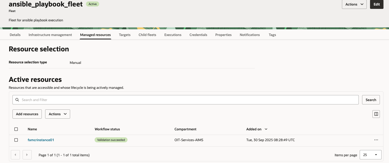 - In OCI Console, andare a Gestione applicazioni flotta > Fleets > ansible_playbook_fleet.