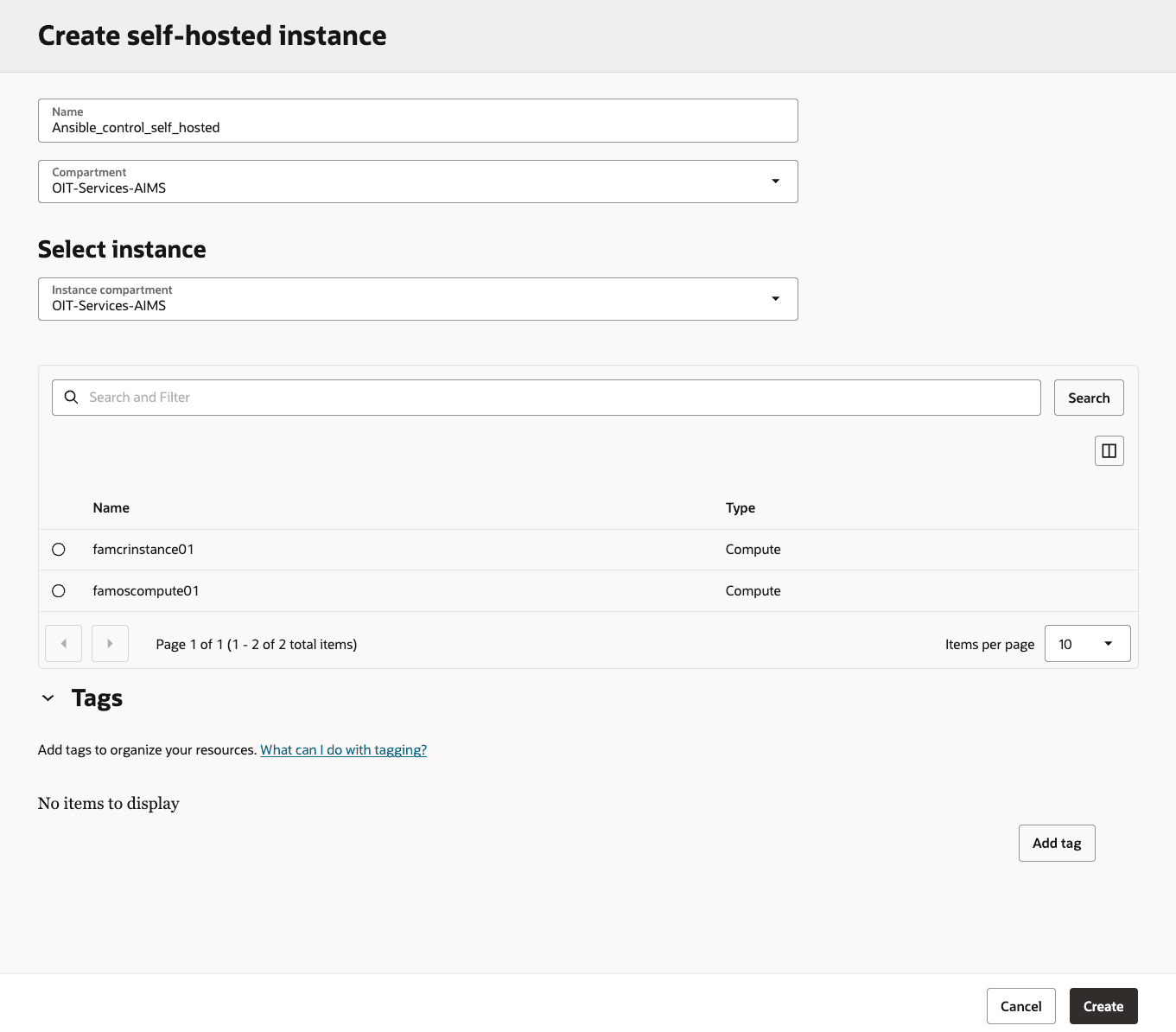 - Compartimento: scegliere il compartimento che contiene l'istanza self-hosted
