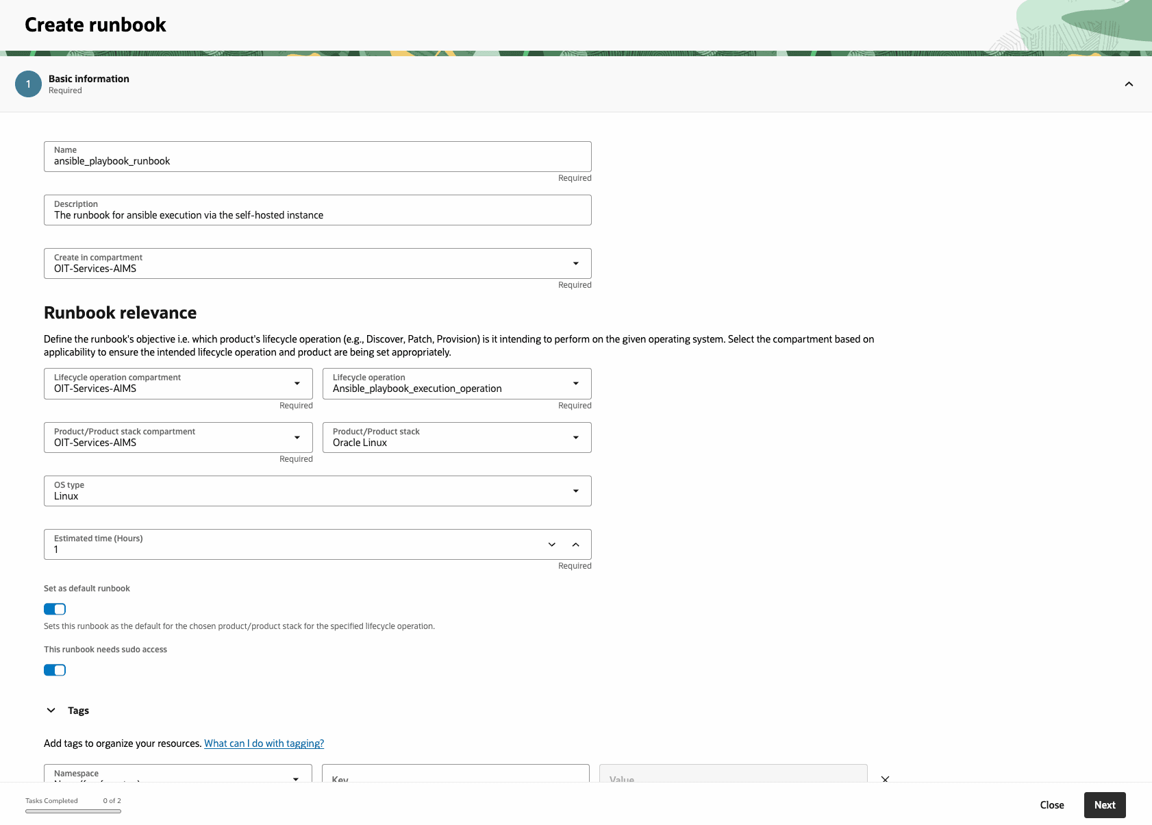 - Creare un nuovo job o una nuova esecuzione, selezionando ansible_playbook_runbook e l'operazione del ciclo di vita.