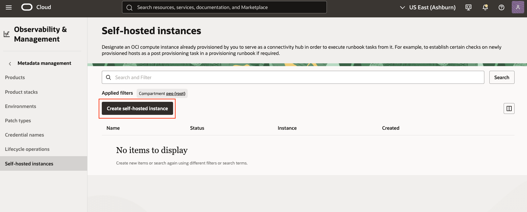 - In Gestione dei metadati, fare clic su Istanze self-hosted e Crea istanza self-hosted.