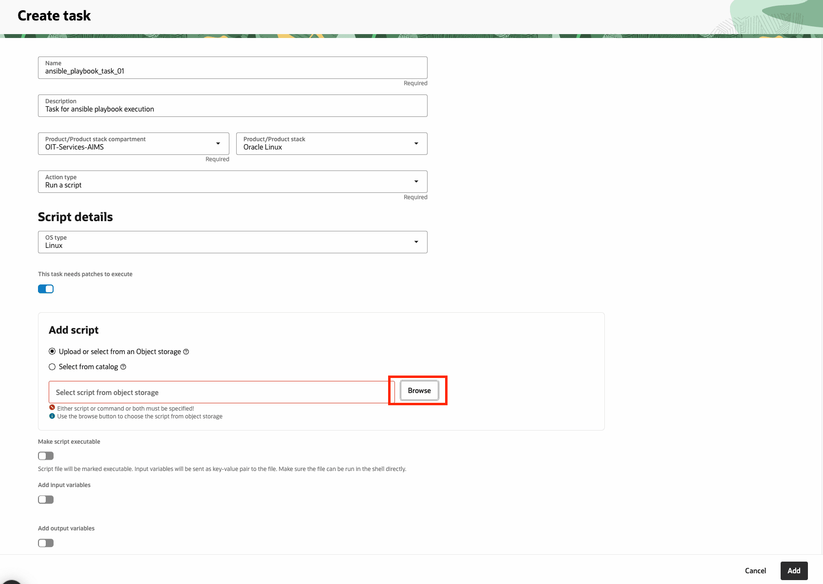 Questa esercitazione sull'esecuzione del playbook ansible con l'istanza self-hosted utilizza il runbook FAM OCI, in grado di definire come eseguire il playbook con variabili. Ad esempio, per eseguire il playbook ansible, si scrive il comando per eseguire il playbook ansible.