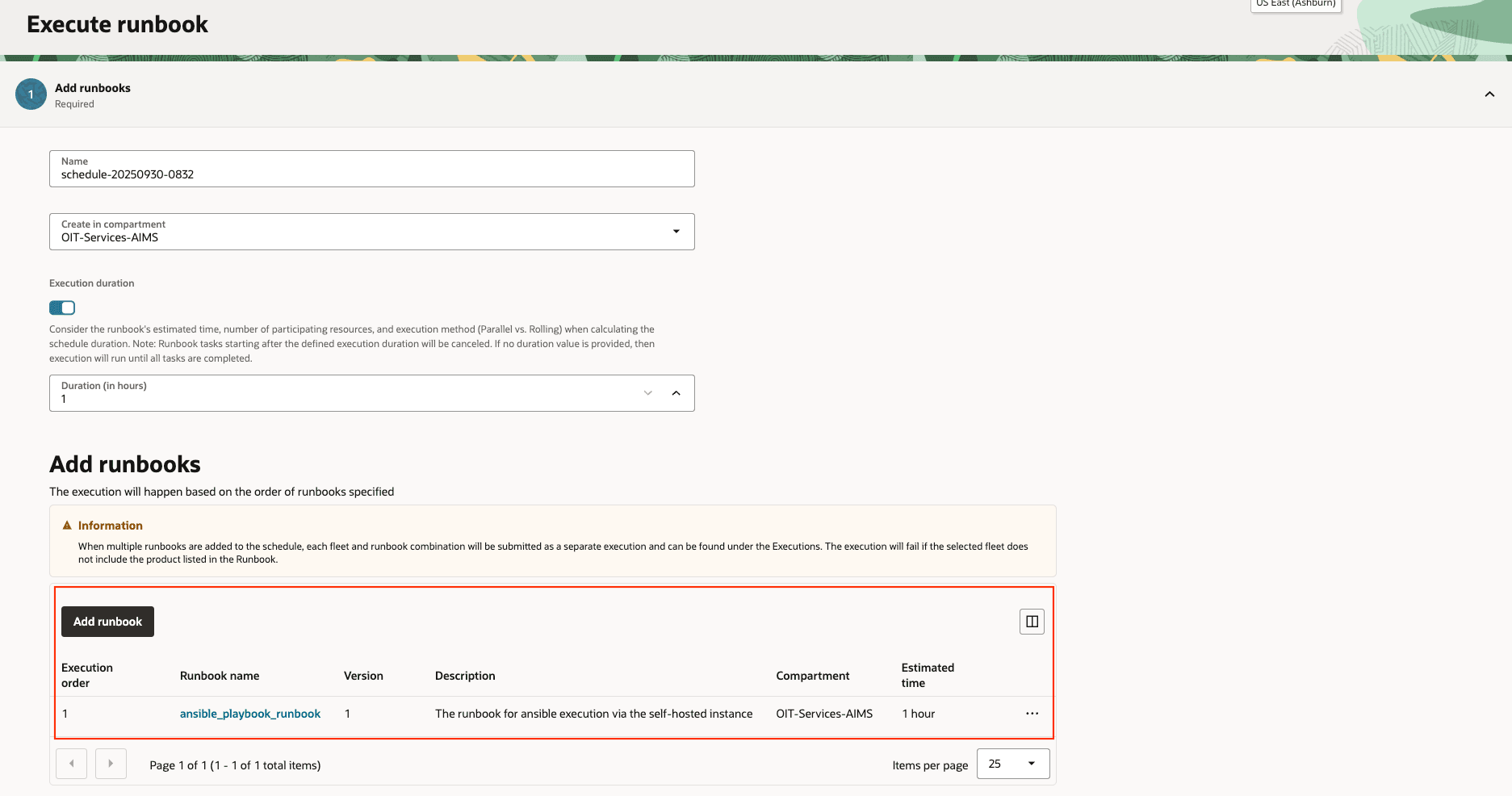 Dopo la creazione del runbook, sei pronto per eseguire l'Ansible Playbook in OCI Fleet Application Management. Ora puoi eseguire il playbook ansible attraverso l'istanza self-hosted. Per eseguire il runbook, creare una flotta contenente l'istanza in hosting automatico.