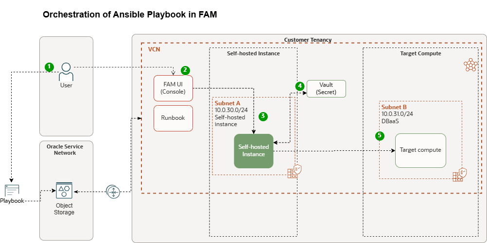 - Esegui il playbook Ansible sui sistemi remoti con l'istanza self-hosted OCI FAM, con il recupero dinamico della chiave SSH da OCI Vault e la utilizza per eseguire l'autenticazione ai sistemi remoti durante l'esecuzione del playbook.