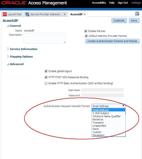 orafed-none: il formato NameID verrà impostato come predefinitoorafed-emailaddress: il formato NameID verrà impostato suurn:oasis:names:tc:SAML:1.1:nameidformat:emailAddressorafed-x509: il formato NameID verrà impostato suurn:oasis:names:tc:SAML:1.1:nameidformat:X509SubjectNameorafed-windowsnamequalifier: il formato NameID verrà impostato suurn:oasis:names:tc:SAML:1.1:nameidformat:WindowsDomainQualifiedNameorafed-kerberos: il formato NameID verrà impostato suurn:oasis:names:tc:SAML:2.0:nameidformat:Kerberosorafed-transient: il formato NameID verrà impostato suurn:oasis:names:tc:SAML:2.0:nameidformat:transientorafed-unspecified: il formato NameID verrà impostato suurn:oasis:names:tc:SAML:1.1:nameidformat:unspecifiedorafed-custom: in questo caso viene visualizzato un campo che consente all'amministratore di indicare il formato NameID personalizzato da utilizzare. Il formato NameID verrà impostato sul formato specificatoorafed-persistent: il formato NameID verrà impostato suurn:oasis:names:tc:SAML:2.0:nameidformat:persistentcustomFormatdovrà essere impostato se FORMAT è impostato suorafed-customUn esempio è:setIdPPartnerNameIDFormat("AcmeIdP", "orafed-emailaddress")