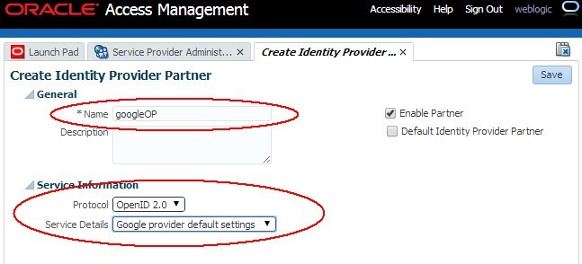 domainRuntime(). - Crea OpenID 2.0 OP Partner: