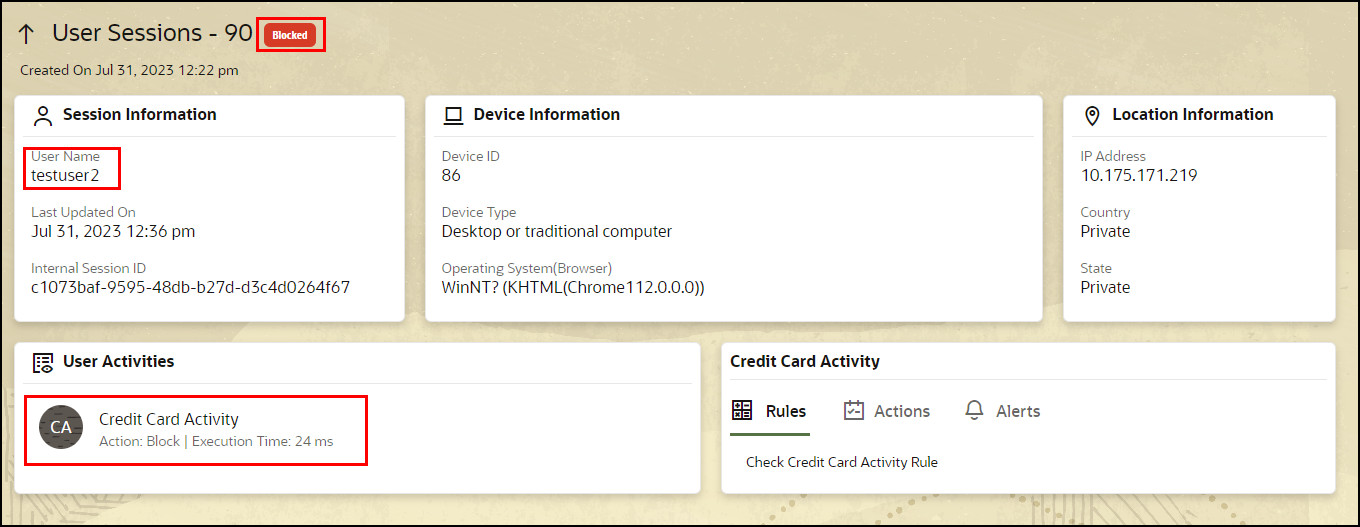 Fare clic sul collegamento in ID sessione per testuser2 creato nel task 2, ad esempio 90. Viene visualizzata la pagina Sessioni utente - 90. L'azione sarà Blocco: