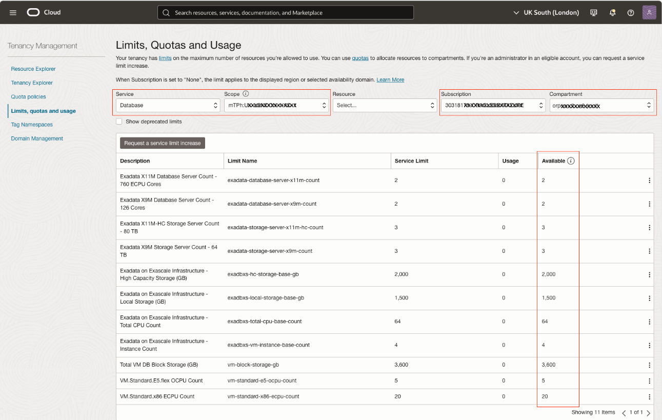 AzureでOracle Databaseリソースのプロビジョニングを開始する前に、Azure環境にデプロイする予定のOracle Databaseリソース(Exadataインフラストラクチャ、Exadata VMクラスタ、Exascale VMクラスタ、CDB、PDBおよびAutonomous Databases)の数を評価します。次に、OCIテナンシの現在のサービス制限を確認し、既存の制限によって必要なOracle Database@Azureリソースの数をデプロイできるかどうかを判断します。