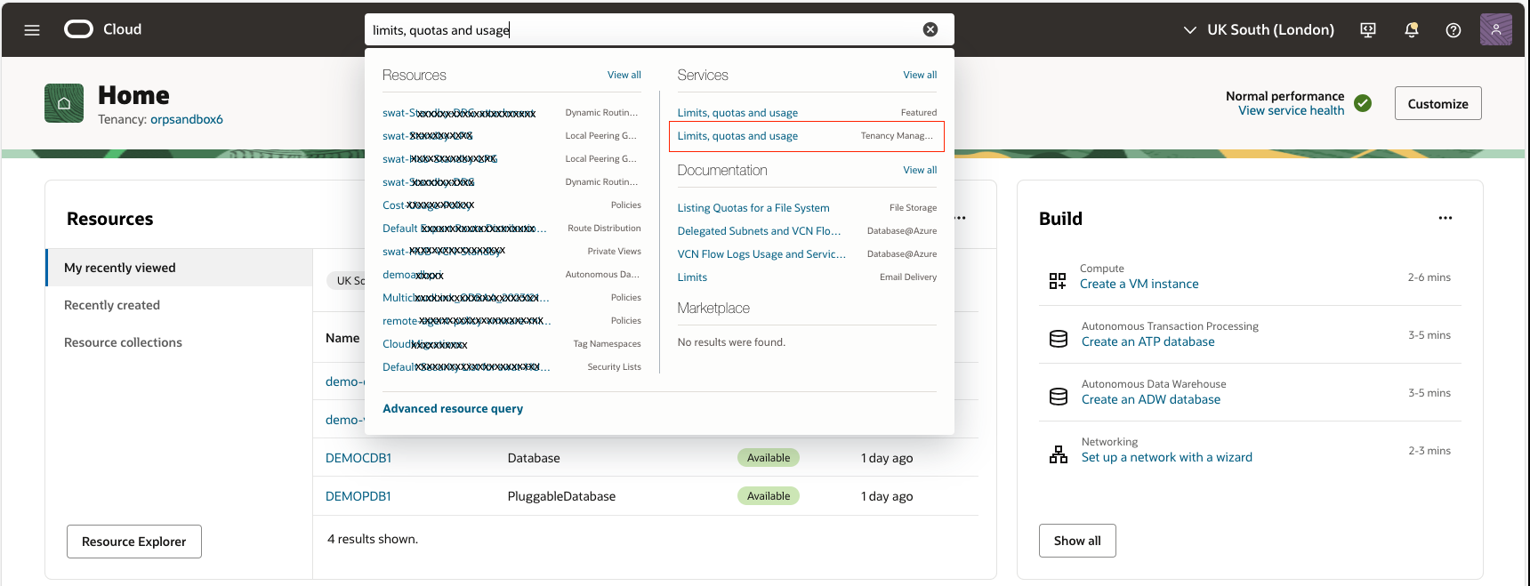- OCIコンソールで「制限、割当ておよび使用状況」を検索し、「制限、割当ておよび使用状況」を選択して、コンソールの「テナンシ管理」セクションでこのページに移動します。