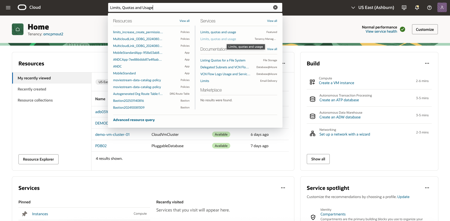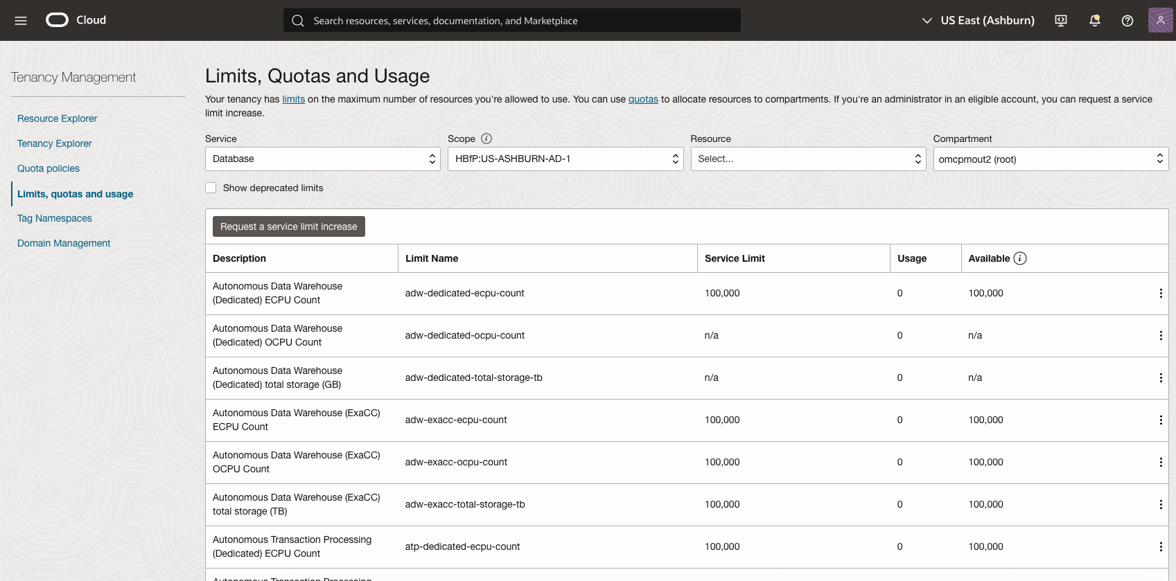 Oracle Database@Google Cloudリソースの使用が時間の経過とともに拡大すると、それに応じて割当てが増加する可能性があります。今後の使用量の著しい増加が予想される場合は、数日前にリクエストを行い、割当て容量のサイズが適切であることを確認します。