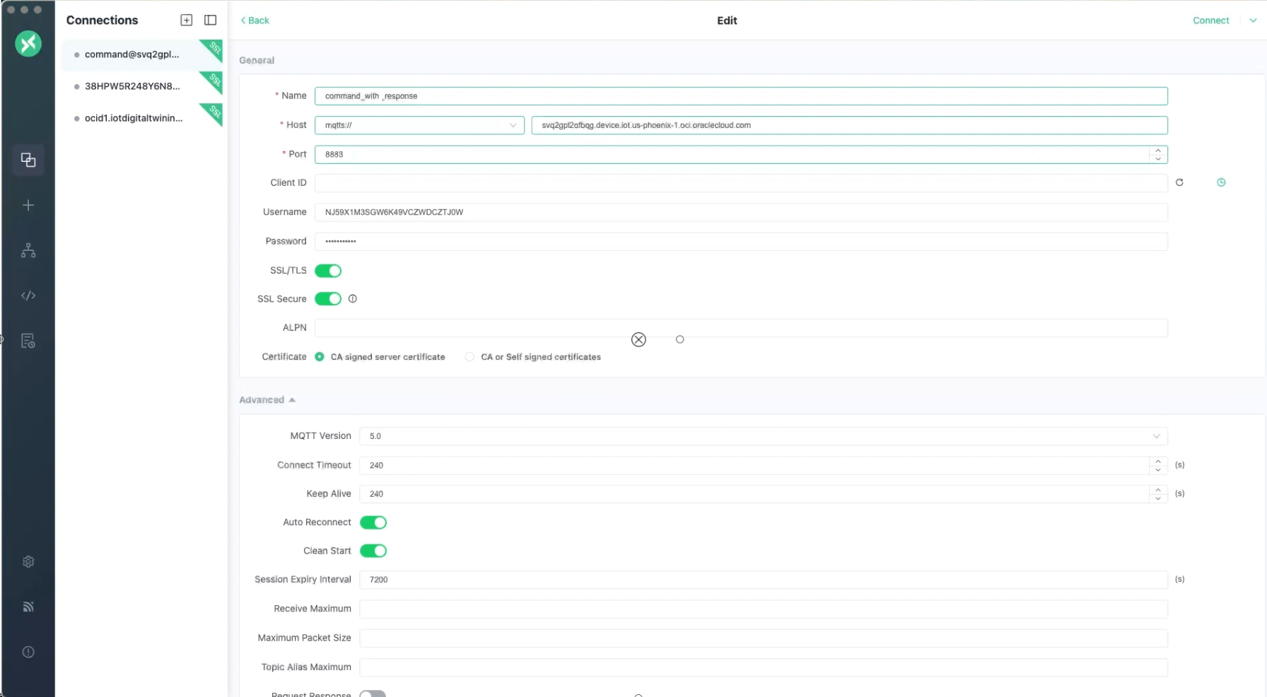 mqtts://プロトコルを選択し、IoTドメインからデバイス・ホスト<domain-short-id>.device.iot.<region>.oci.oraclecloud.comを入力します。「IoTドメインの詳細の取得」を参照してください。 - ポート(