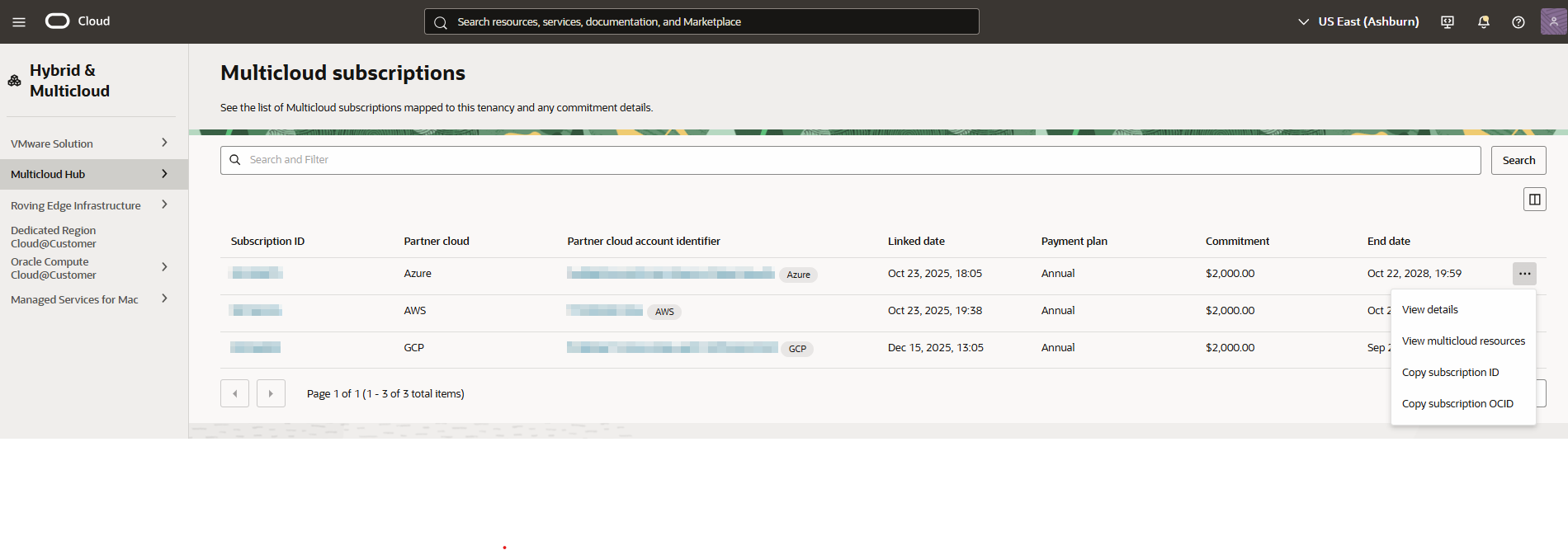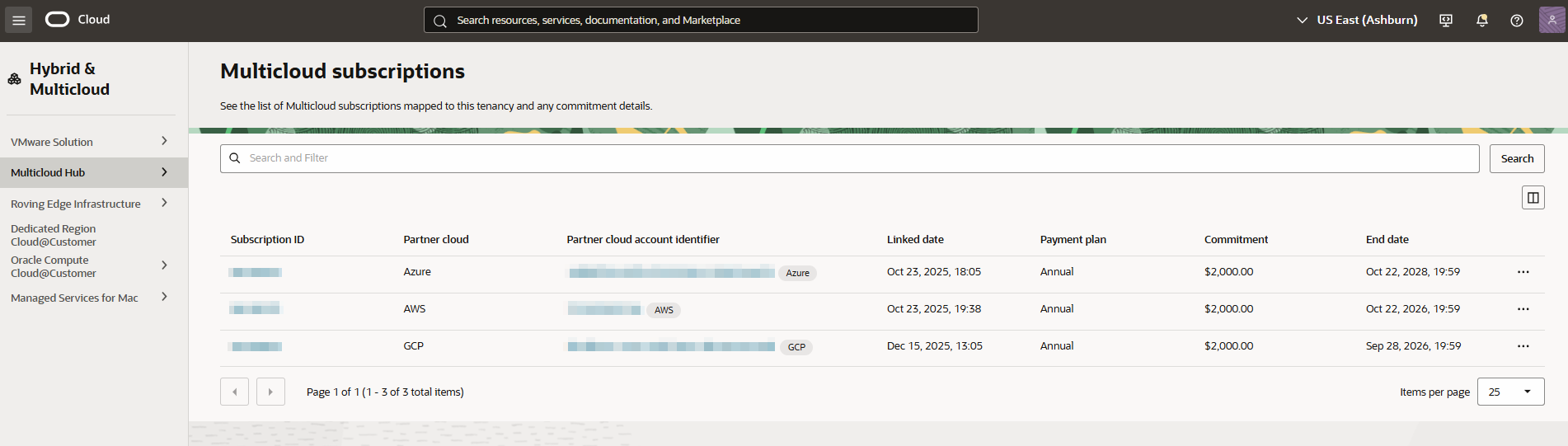 コンソールのOracle Multicloud Hubを使用して、テナンシでアクティブ化されたマルチクラウド・サブスクリプションを表示します。各マルチクラウド・サブスクリプションの詳細には、サブスクリプションID、パートナ・クラウド(名前およびアカウント識別子)、リンク日、支払プラン、コミットメントおよび終了日が含まれます。