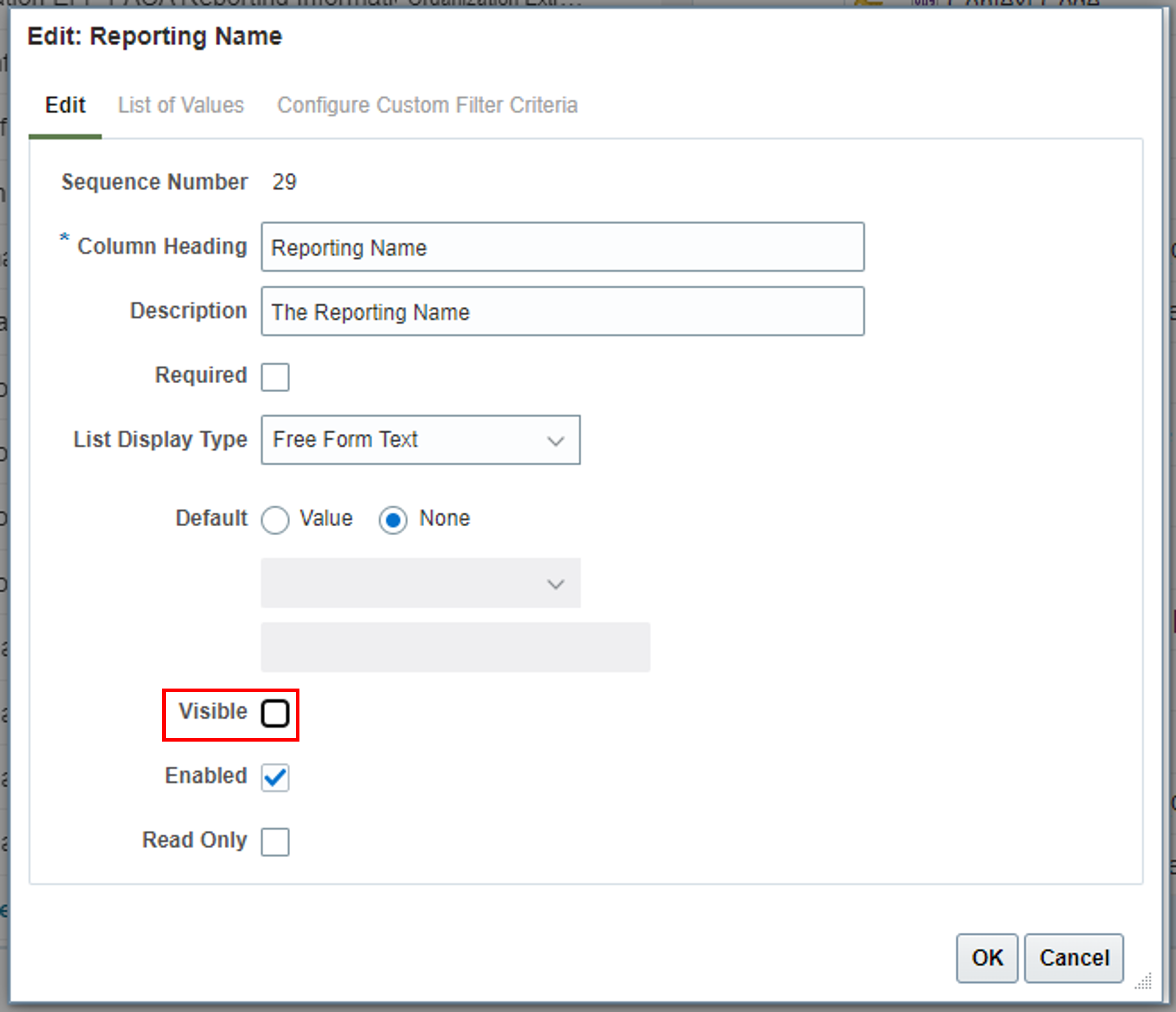 - これらの4つの属性を編集して、上の表で指定したデフォルト値を定義し、非表示にします。