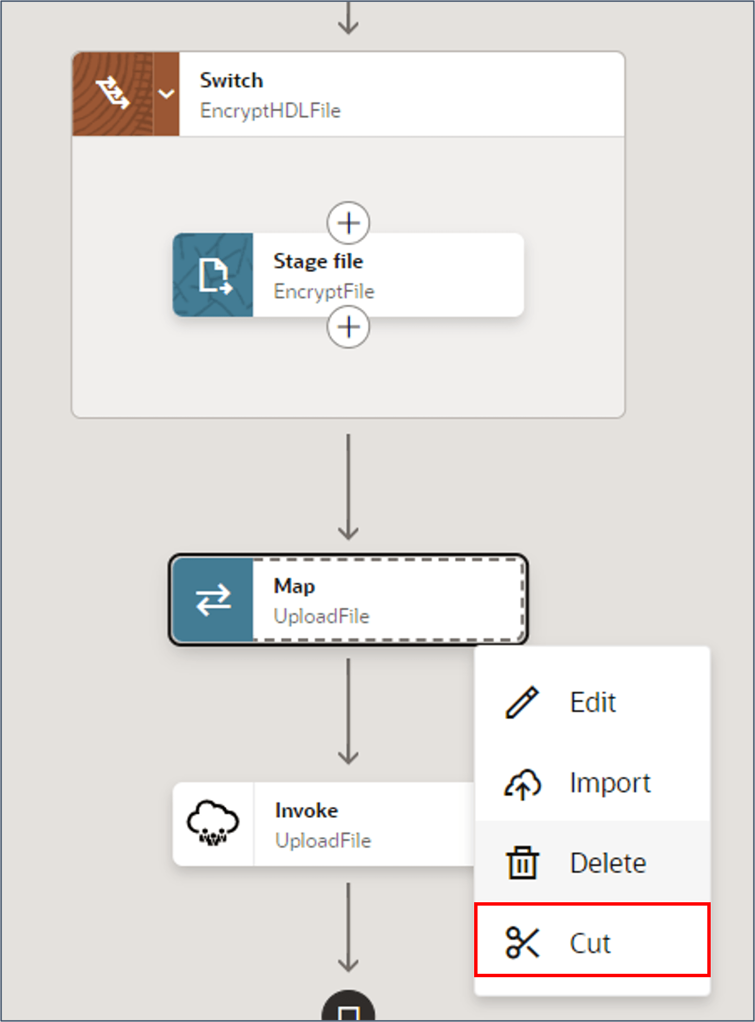 - 「マップ」UploadFileアクションをクリックし、「切取り」を選択します。
