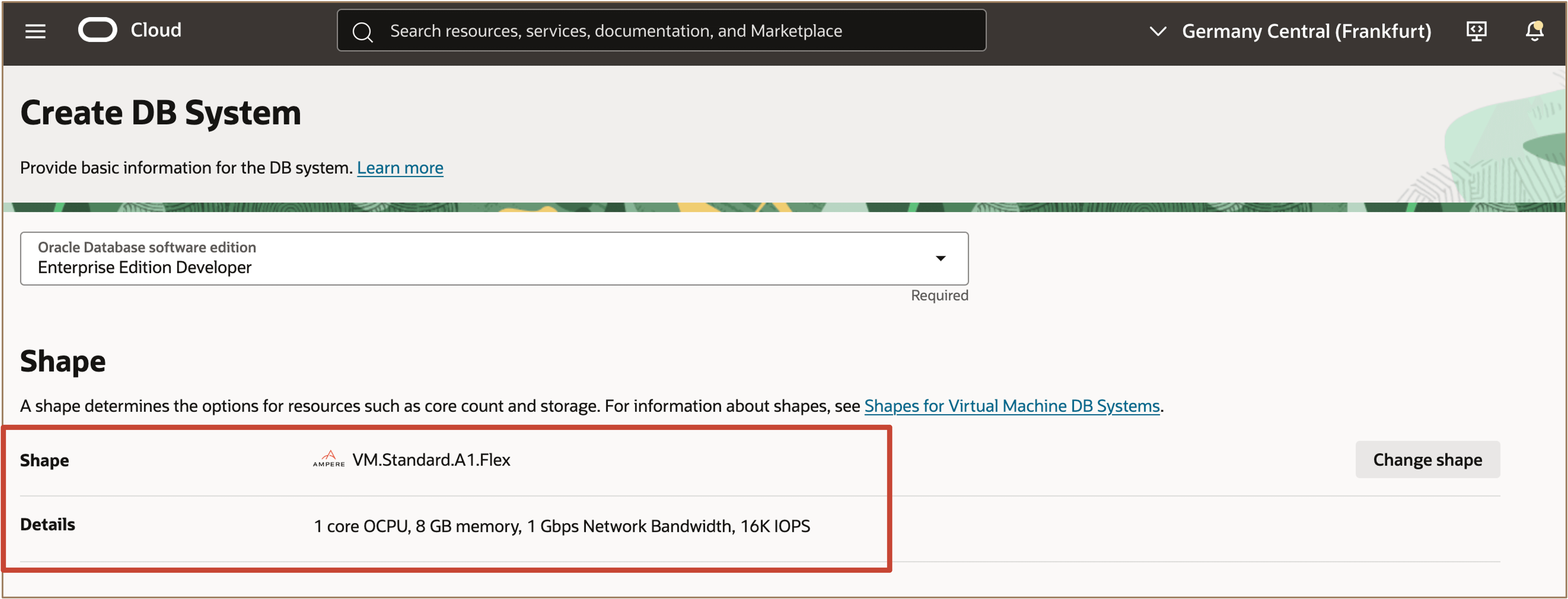 ノート:シェイプはデフォルトでVM.Standard.A1に設定されます。フレックス(アンペア)。Base Database Service for Developersは、現在、A1シェイプでのみ使用できます。