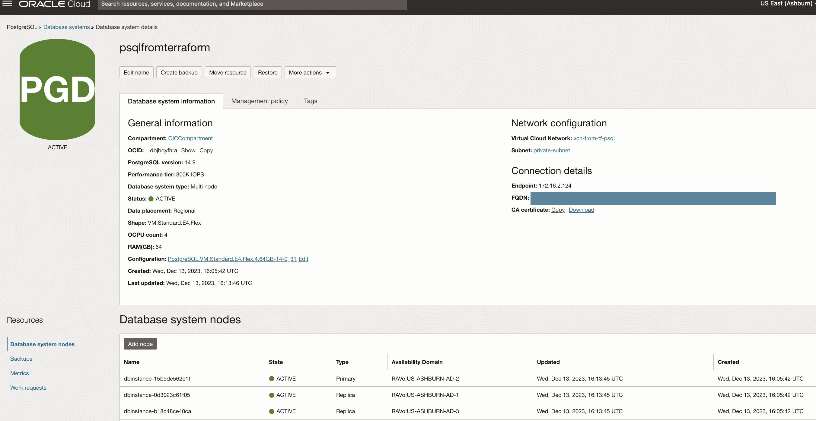 In this tutorial, we will learn how we can deploy three nodes of an OCI managed PostgreSQL database system in an OCI cloud tenancy and connect privately through a compute instance using Terraform script.