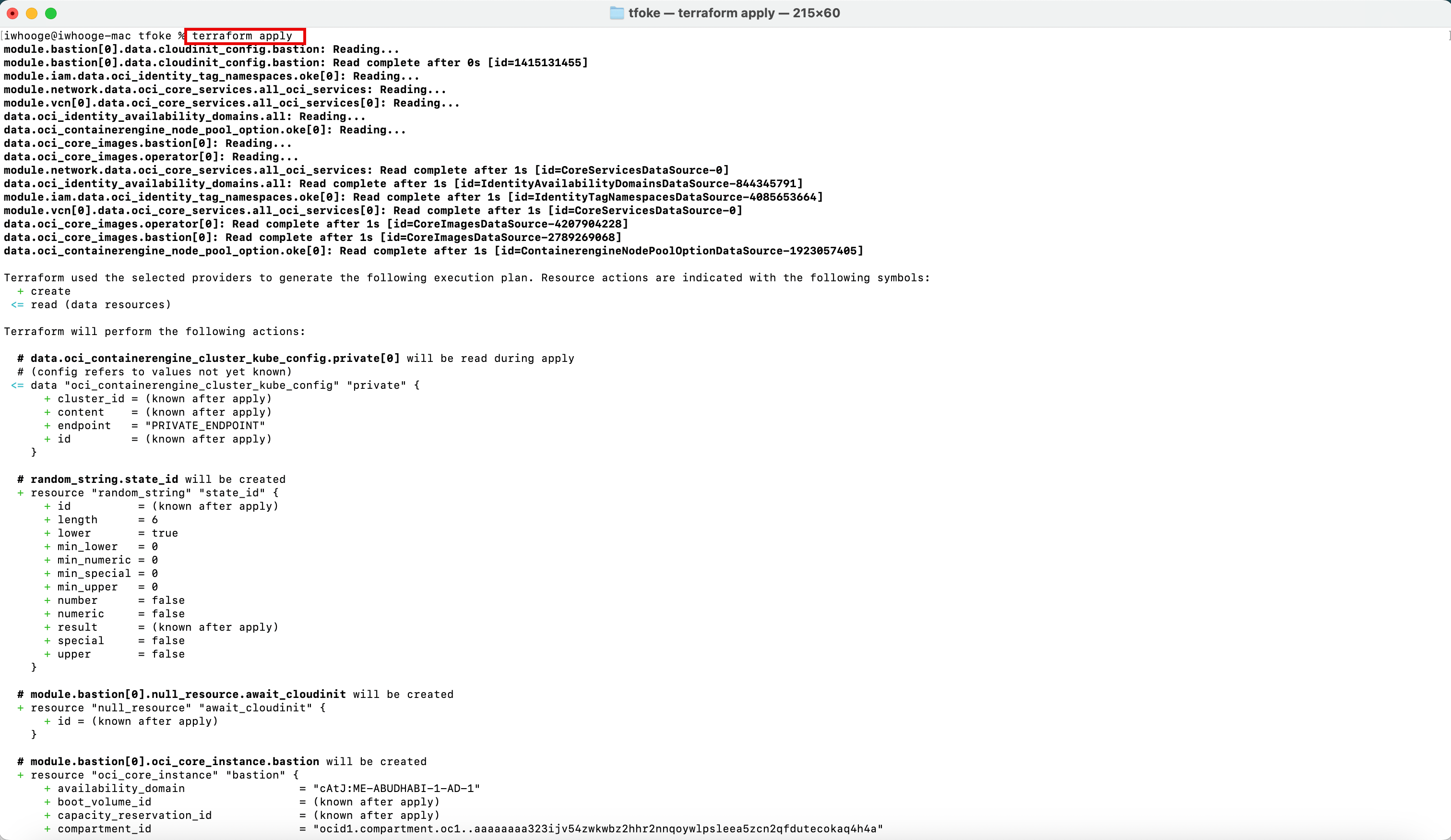 タスク2: Terraform適用の実行および必要なリソース(VCN、サブネットなど)を使用した1つのOKEクラスタの作成