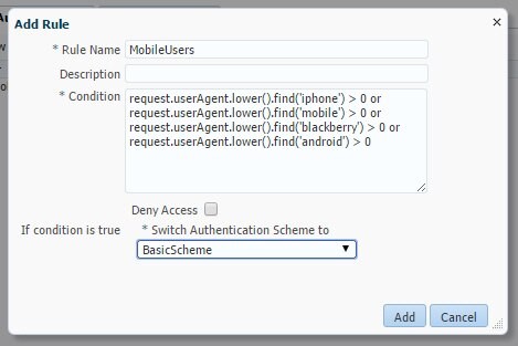 次に、スマートフォンのユーザーに対してBasicSchemeを使用するようにOAMに示す事前認証ルールを作成します。ルールはUserAgent HTTPヘッダーに基づきます。