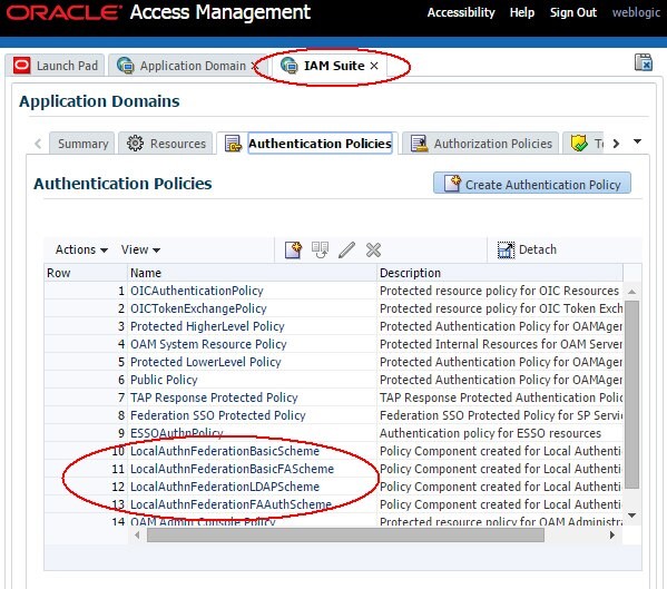 初期状態では、IdPによって実行時にユーザーを認証するために使用される、IAM Suiteアプリケーション・ドメインに存在する4つのフェデレーション認証ポリシーがあります。