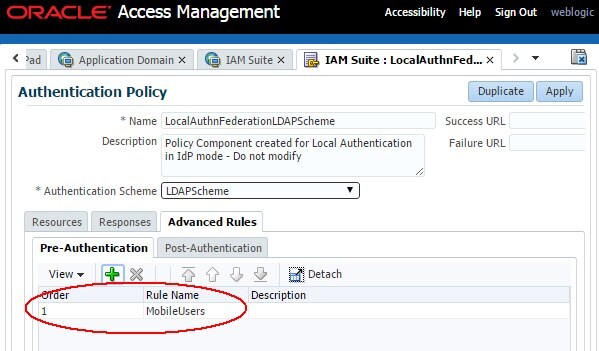 そのスキームのOAM認証ポリシーは、ブラウザがデスクトップ・ブラウザかモバイル・ブラウザかを評価する認証前拡張ルールを持つように構成されます。