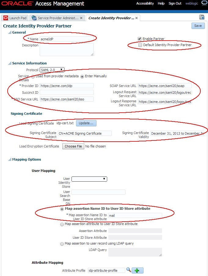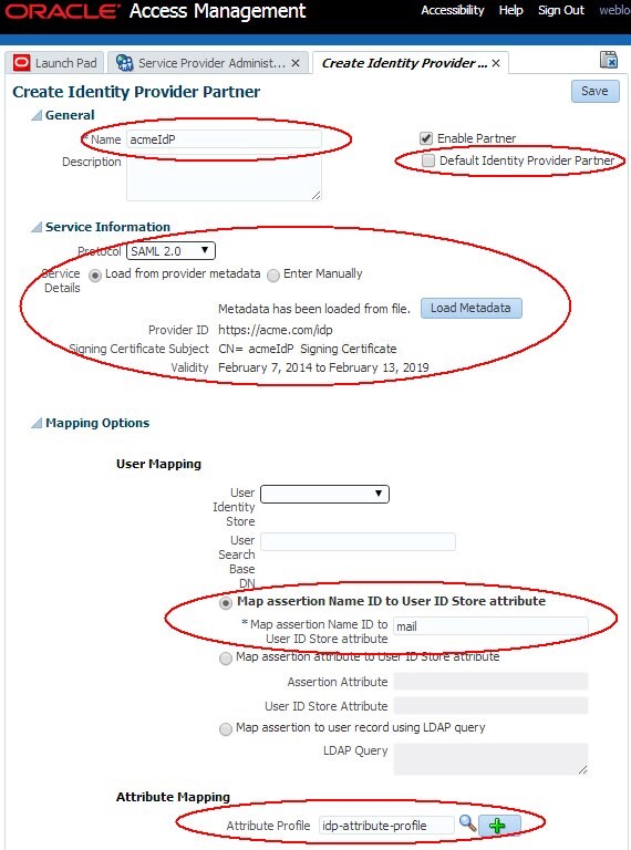 OAMおよびSPでのSAML 2.0 IdPパートナの作成
