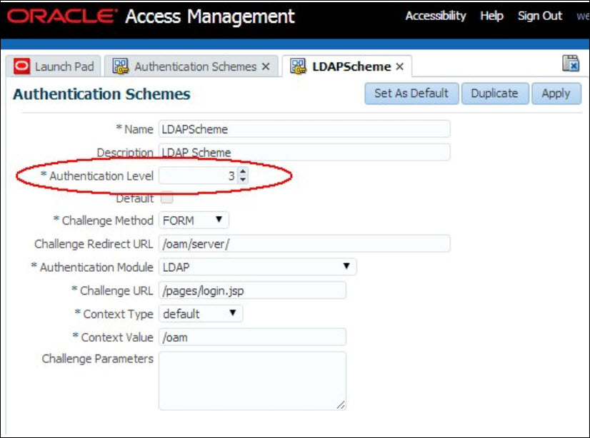 LDAPSchemeをOAM認証スキームとして使用してユーザーにチャレンジして識別するように構成されています。これは、IdPのデフォルトのグローバル・スキームとして設定されています。管理者は次のことができます。- ユーザーの認証に使用するグローバルなデフォルトのOAM認証スキームを設定します。