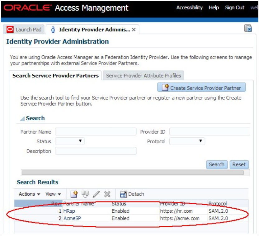 LDAPSchemeです AcmeSPとHRspの両方がデフォルトのSAML 2.0 SPパートナ・プロファイルを使用しています
