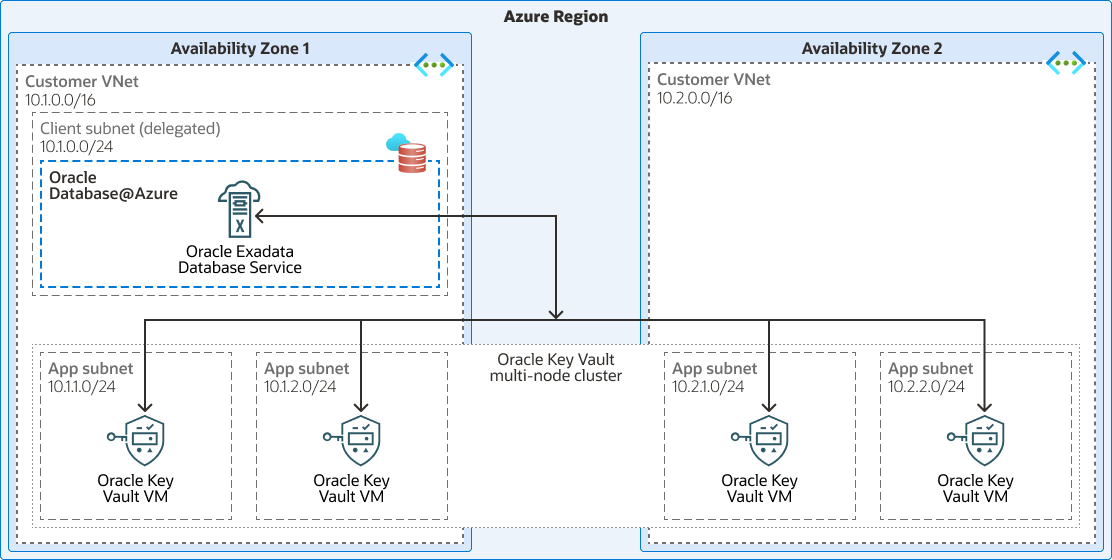 アーキテクチャ・ダイアグラムは、Oracle Exadata Database Service (Oracle Database@Azure)でOracle Databaseに対して継続的に使用可能で、非常にスケーラブルで、フォルト・トレラントなキー管理を提供するためにAzureで推奨されるOracle Key Vaultマルチマスター・クラスタを示しています。