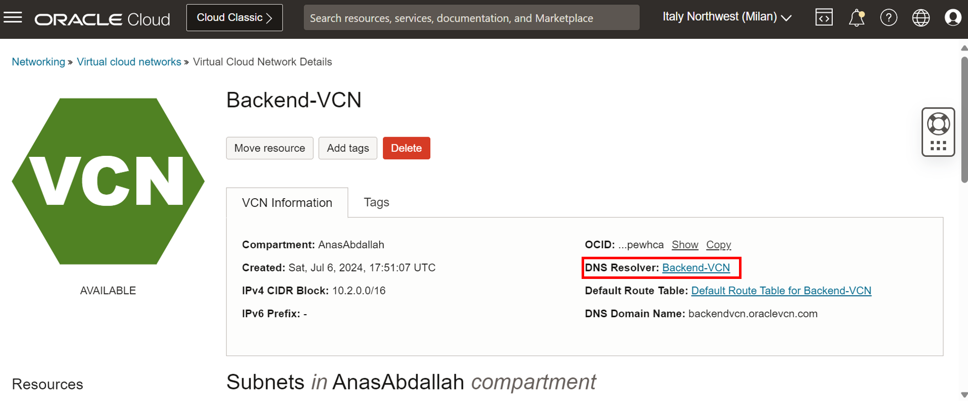 - 백엔드-VCN으로 이동하고 DNS 분석기를 누릅니다.