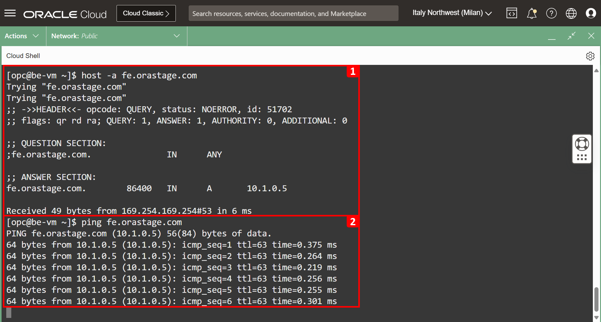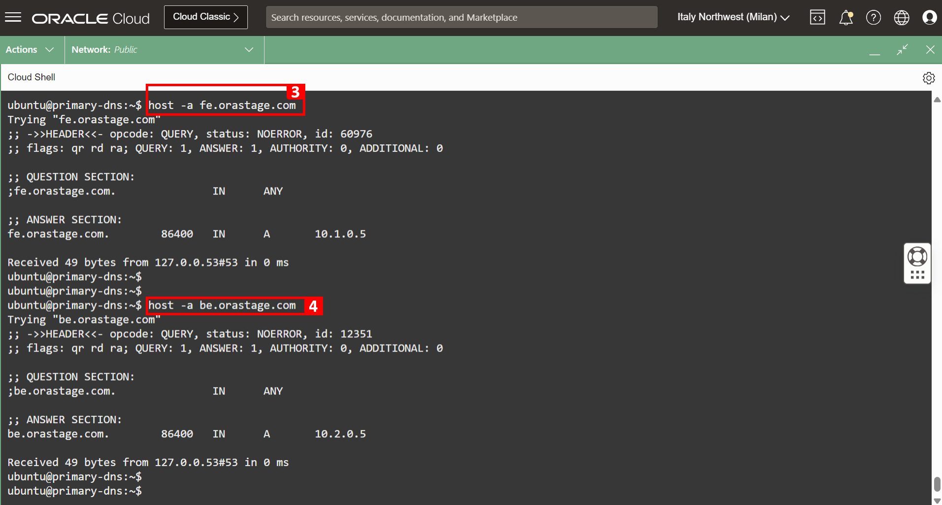 fe.orastage.com까지orastage.com질의를 테스트합니다. 다른 방법을 사용하여 설정을 검증할 수 있습니다.host명령을 실행합니다.ping명령을 실행합니다.dig명령을 실행합니다.