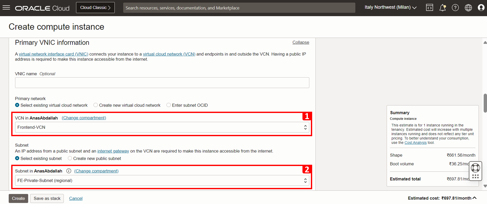 - 네트워킹 구성: VCN(Frontend-VCN) 및 해당 서브넷을 선택합니다.