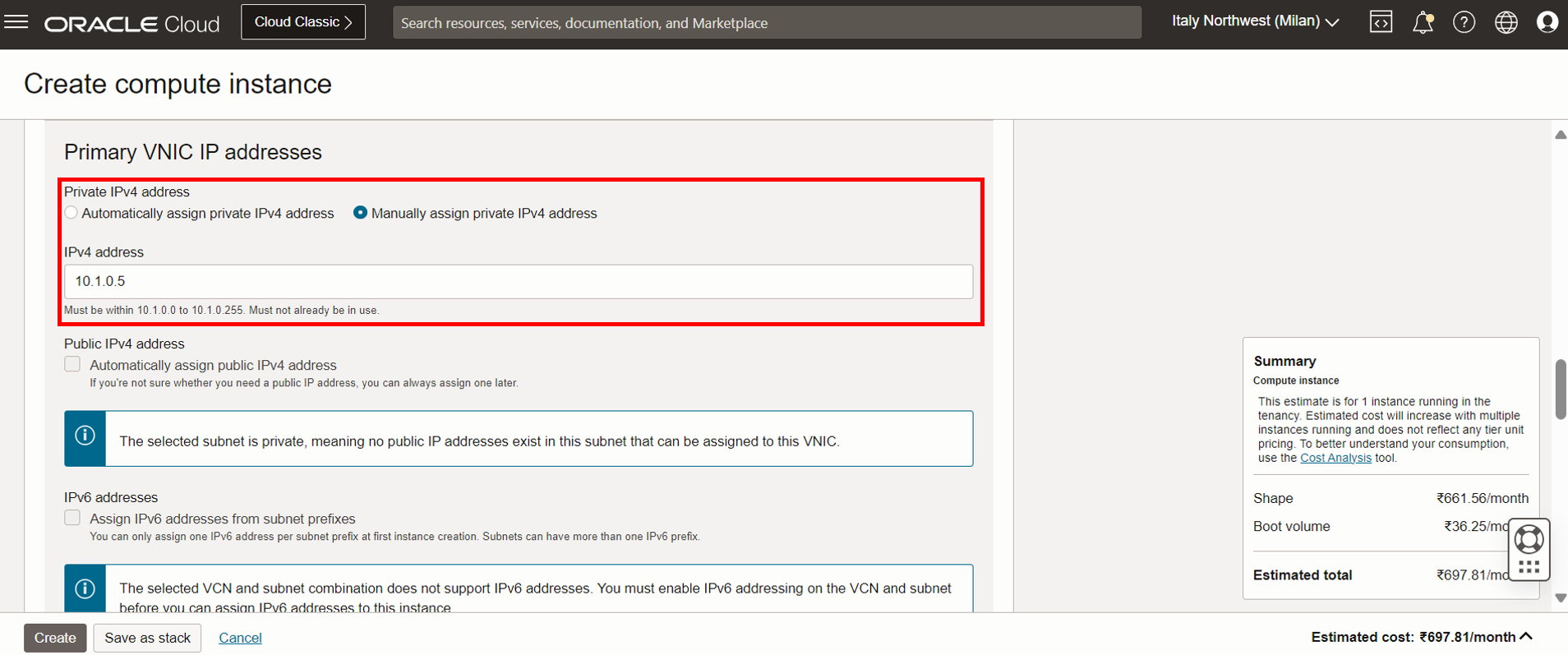 - 네트워킹 구성: VCN(백엔드-VCN) 및 해당 서브넷을 선택합니다.