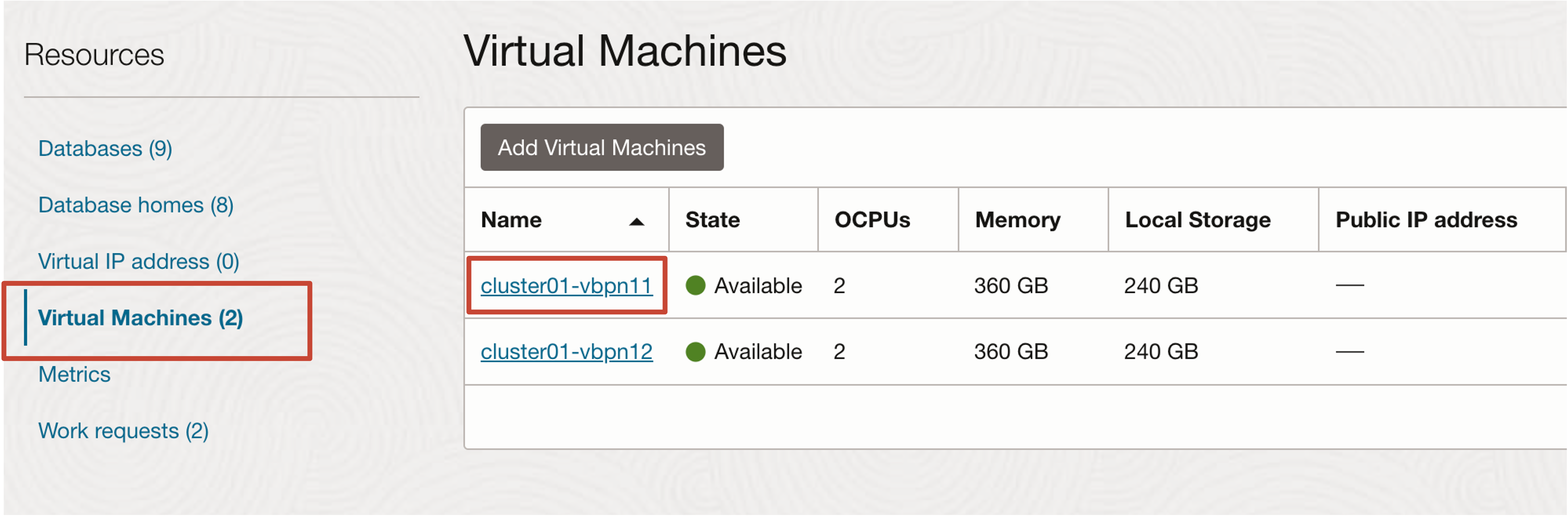 Exadata VM 클러스터 및 직렬 콘솔 접속을 생성할 가상 시스템이 포함된 VM 클러스터의 이름을 누릅니다.